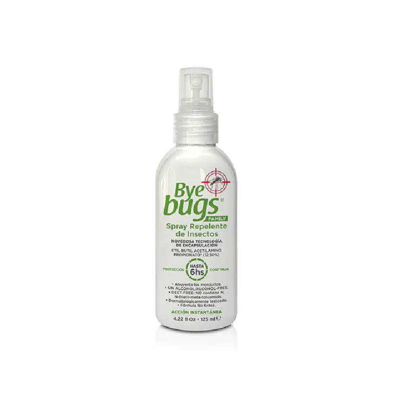 Bye Bugs es un repelente en spray de amplio espectro de especies de mosquitos, no irrita la piel (NO CONTIENE ALCOHOL), no es graso y con agradable aroma.