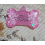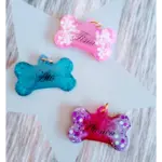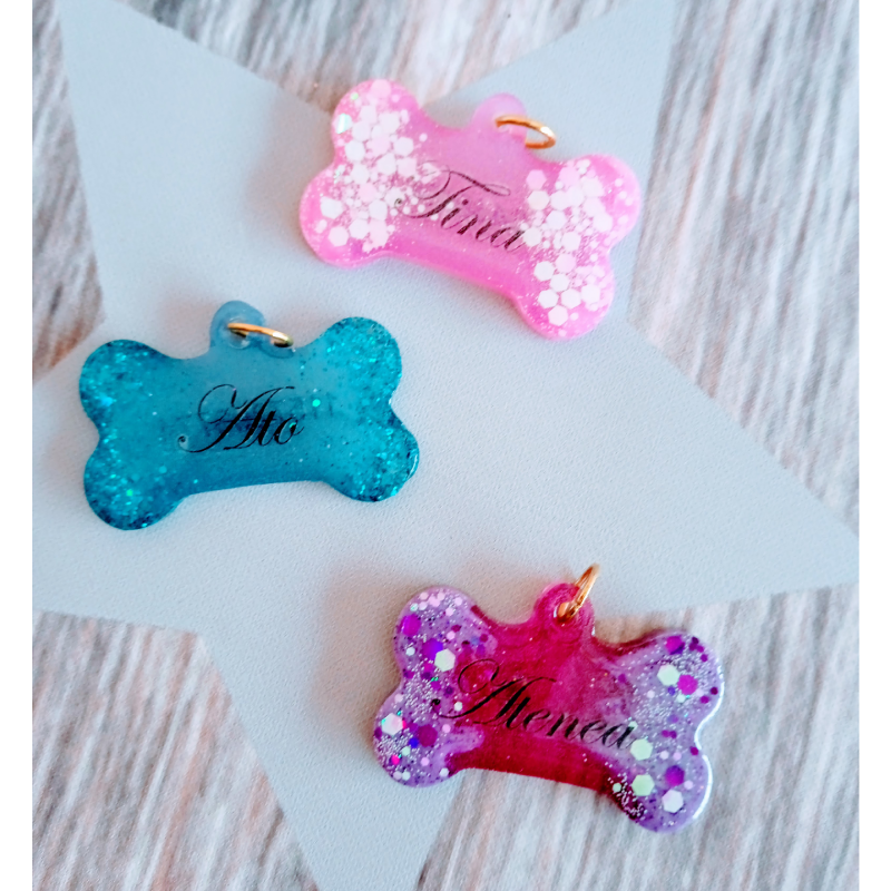 Chapita con Forma de Hueso hecho en resina, con aplicación de givre, glitters, flores secas y glitters holográficos.