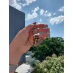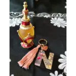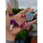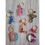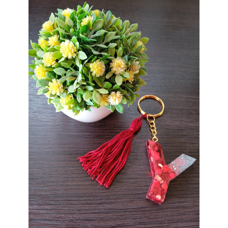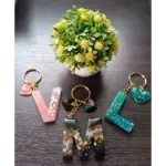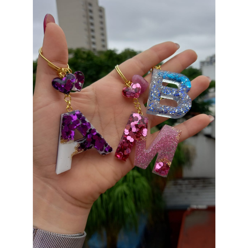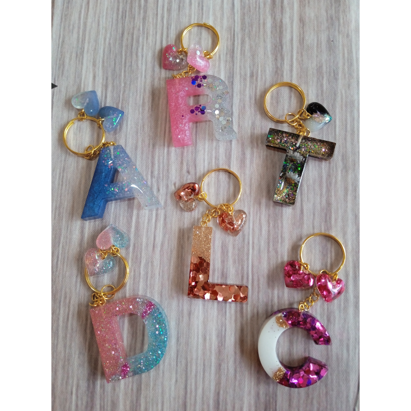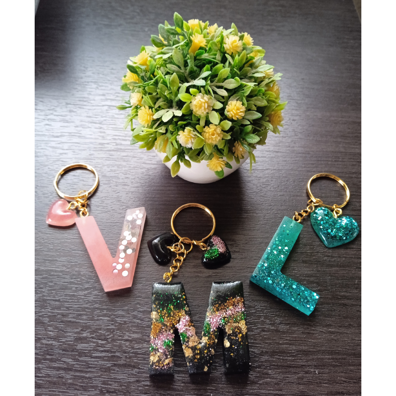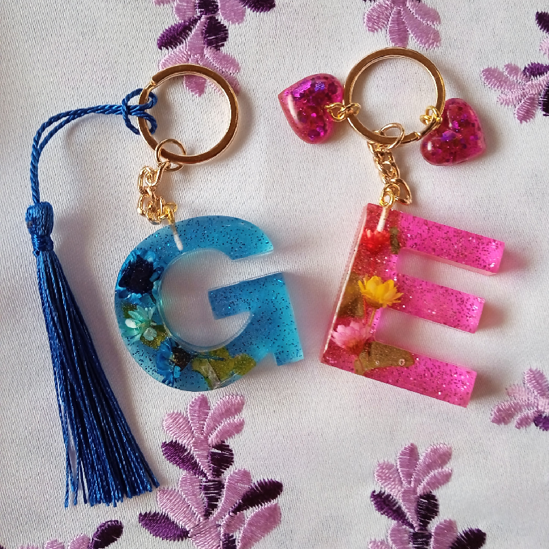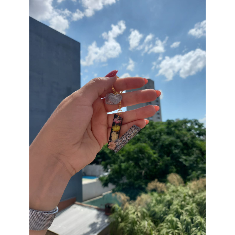 LLavero con forma de letra hecho en resina, con aplicación de givre, glitters, flores secas y glitters holográficos.