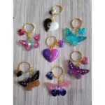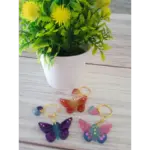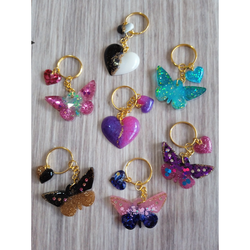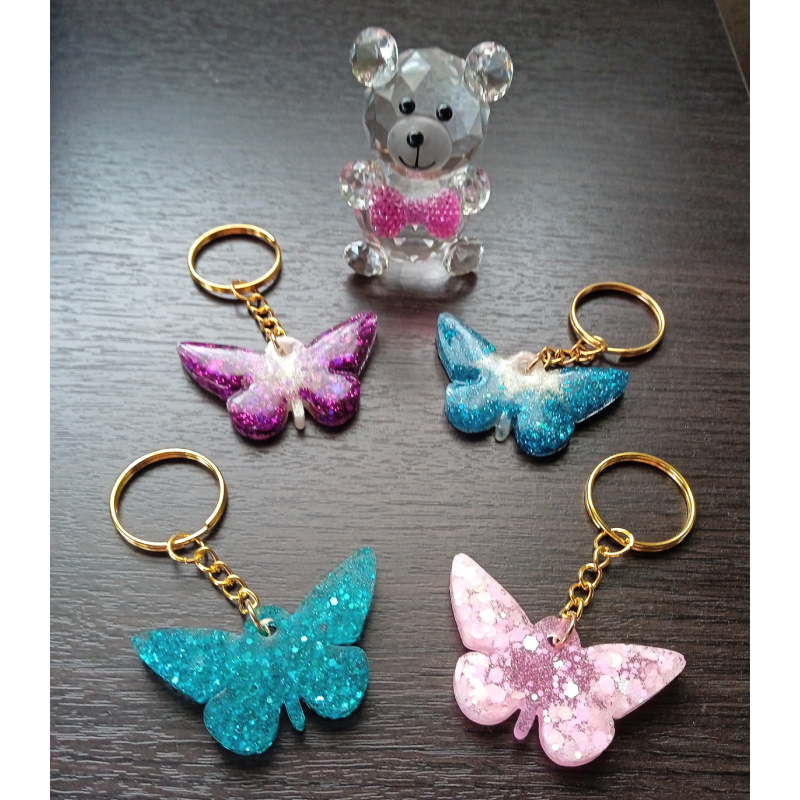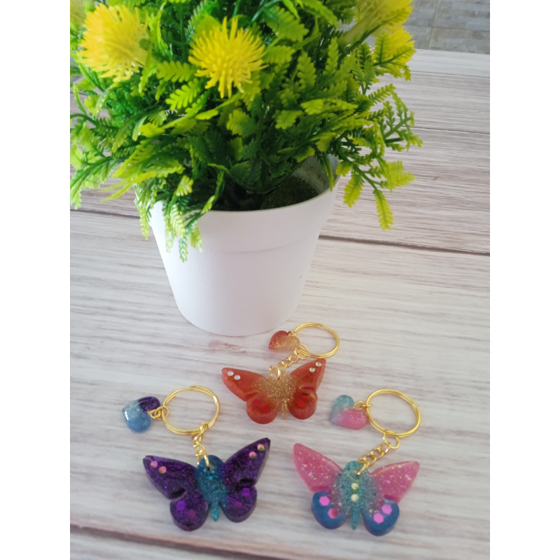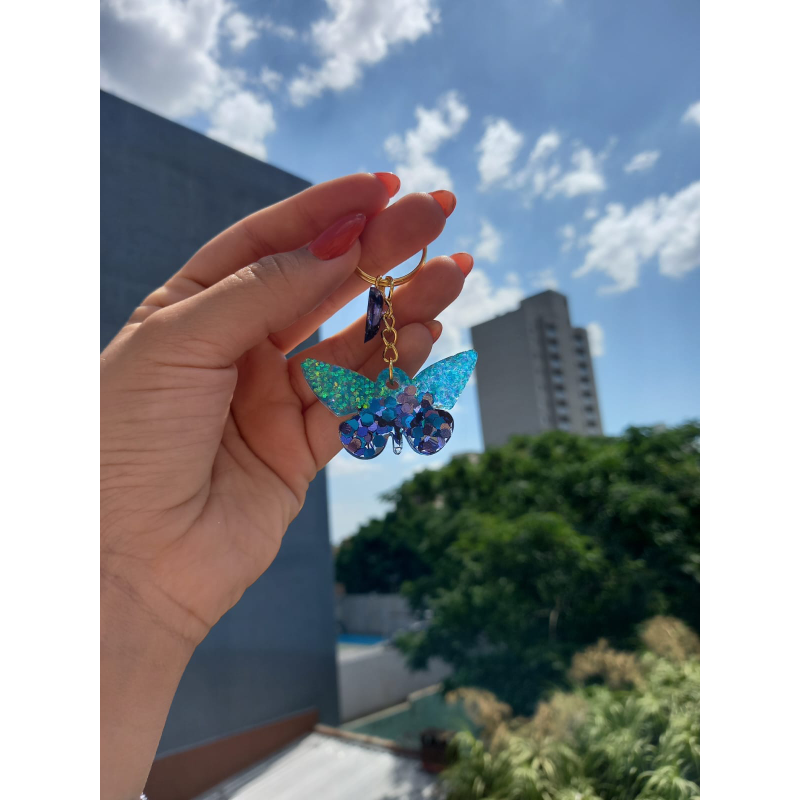 LLavero con forma de Mariposa hecho en resina, con aplicación de givre, glitters, flores secas y glitters holográficos.