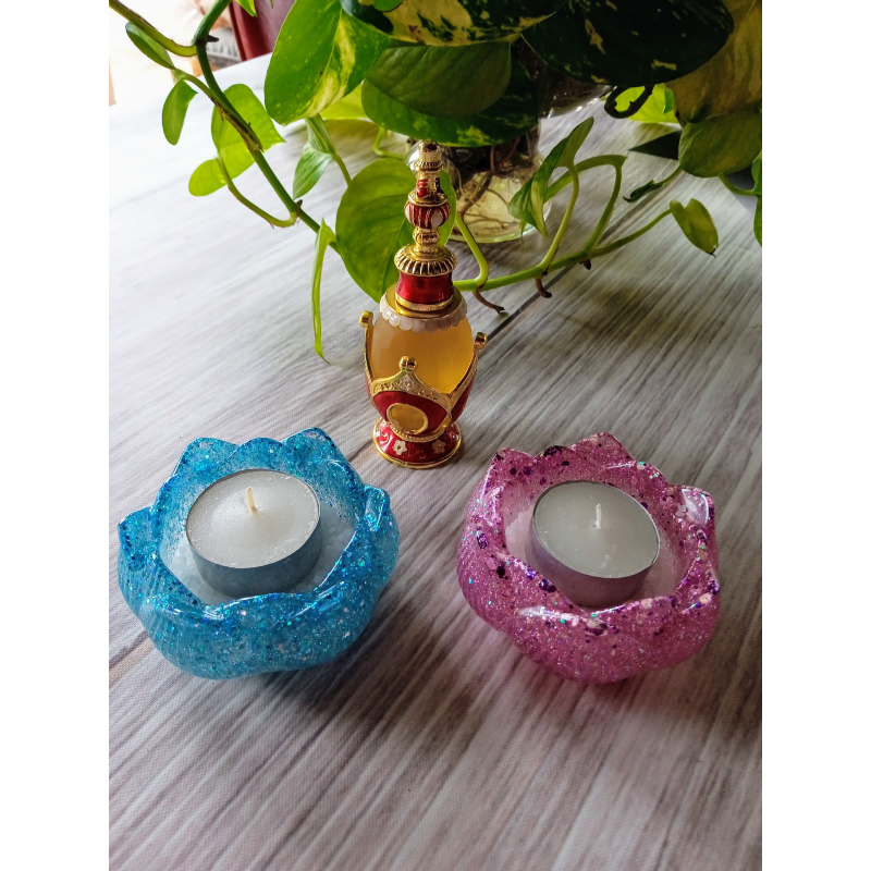 Portavela circular con petalos hecho en resina, con aplicación de givre, glitters, flores secas y glitters holográficos.