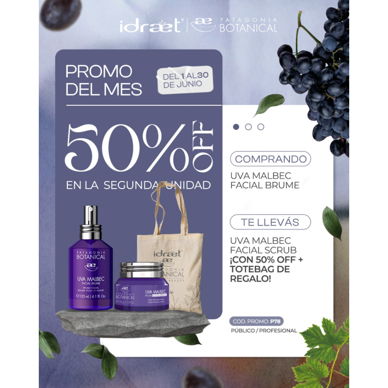Comprando UVA MALBEC FACIAL BRUME, te llevás el FACIAL SCRUB de la misma línea con 50% OFF ¡y además una tote bag de regalo!
